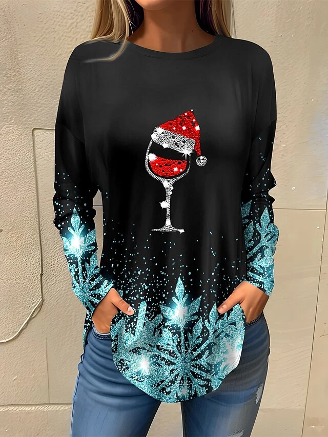 Women’s T Shirt Tee Christmas Shirt Red Blue Purple Snowflake Wine Glass Rhinestone Print Long Sleeve Party Christmas Weekend Festival / Holiday Christmas Round Neck Regular Fit Painting Spring
