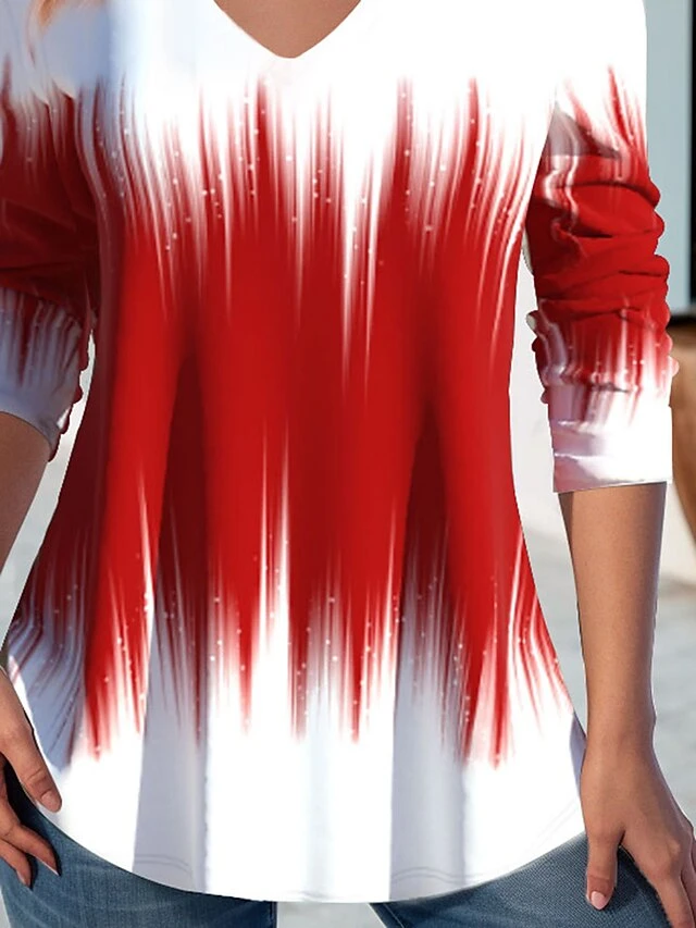 Women’s T Shirt Tee Christmas Shirt Red Color Block Print Long Sleeve Daily Weekend Basic Christmas V Neck Regular Fit Painting Spring &Fall