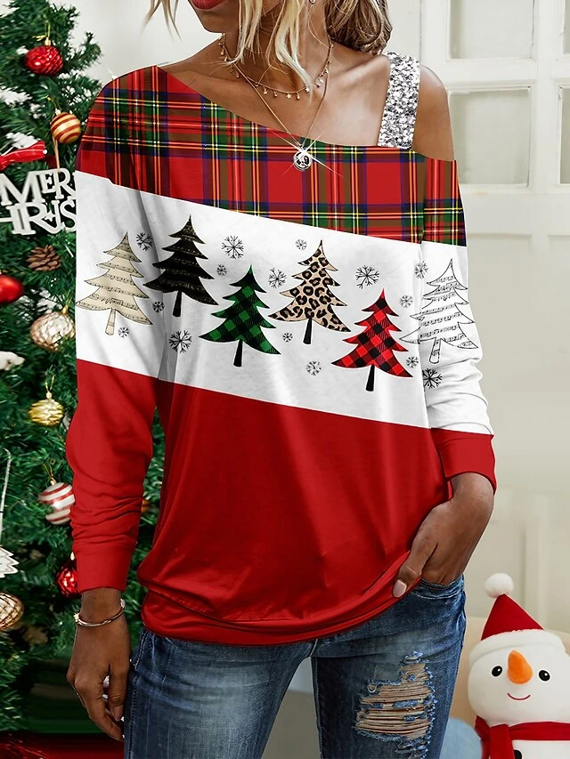 Women’s T Shirt Tee Christmas Shirt Red Plaid Christmas Tree Print Long Sleeve Party Christmas Weekend Festival / Holiday Christmas Diagonal Neck Regular Fit Painting Spring &Fall