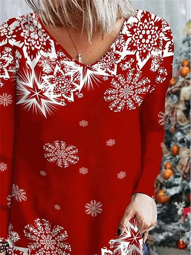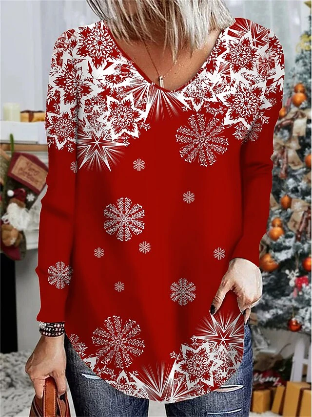 Women’s T Shirt Tee Christmas Shirt Red Snowflake Print Long Sleeve Party Christmas Weekend Daily Basic Print V Neck Regular Fit Painting Fall & Winter