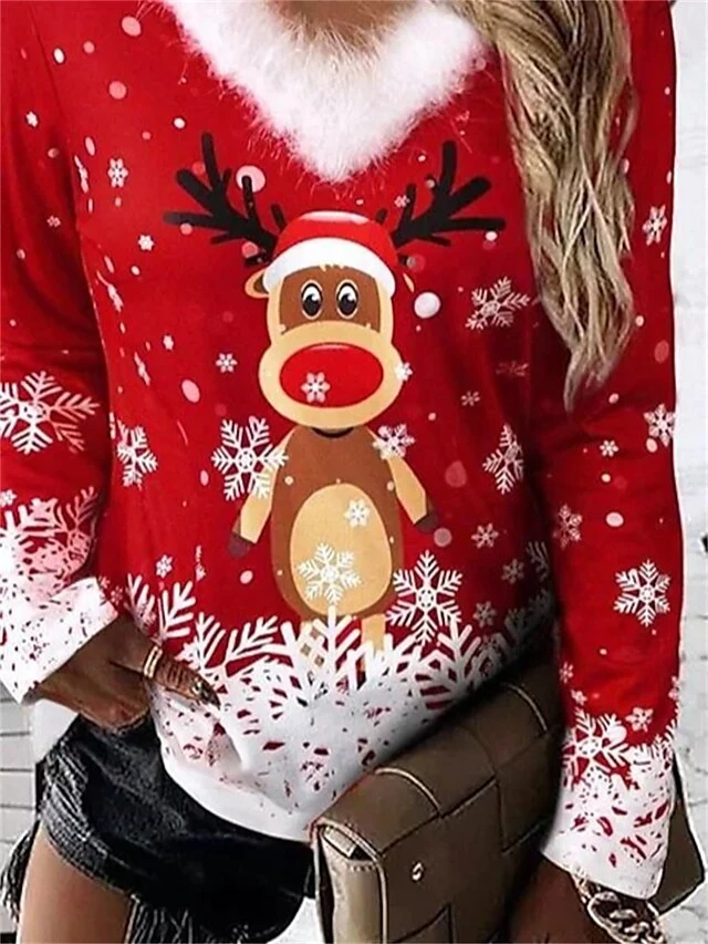 Women’s T Shirt Tee Christmas Shirt Red Snowflake Reindeer Print Long Sleeve Party Christmas Weekend Festival / Holiday Christmas Fur Collar V Neck Regular Fit Painting Spring &Fall