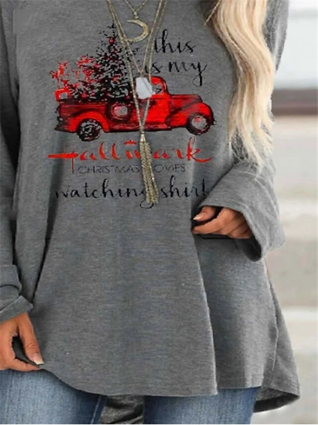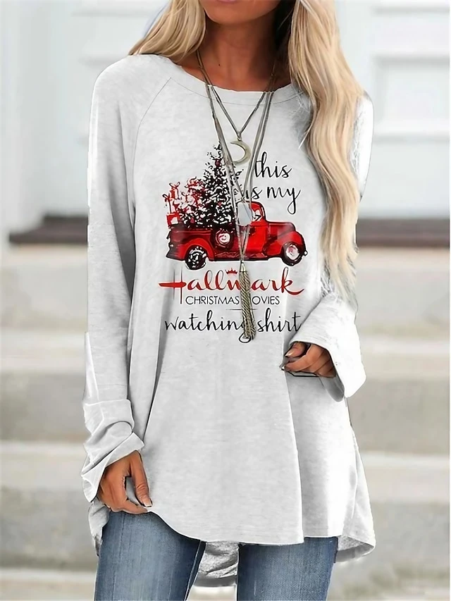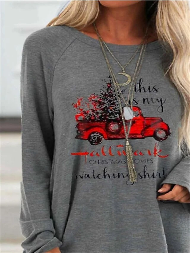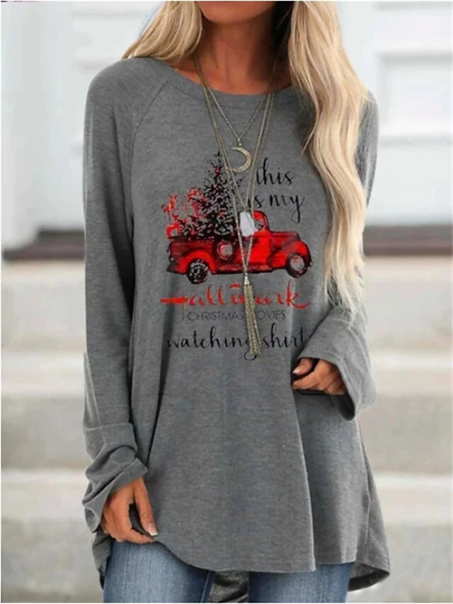 Women’s T Shirt Tee Christmas Shirt White Gray Letter Christmas Tree Long Sleeve Christmas Gift Basic Christmas Round Neck Regular Fit