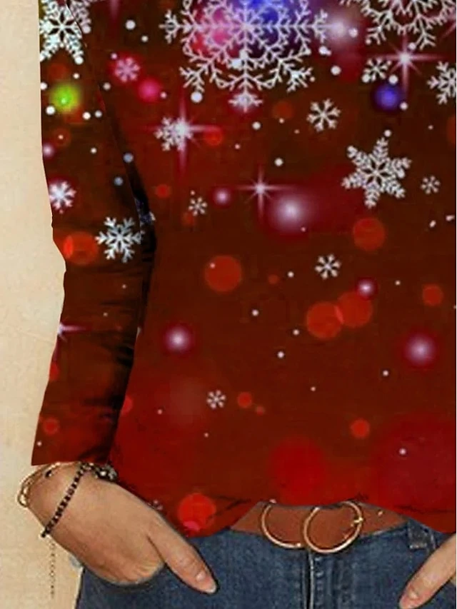 Women’s T Shirt Tee Christmas Shirt Wine Red Blue Christmas Tree Snowflake Print Long Sleeve Christmas Weekend Basic Christmas Round Neck Regular Fit Painting
